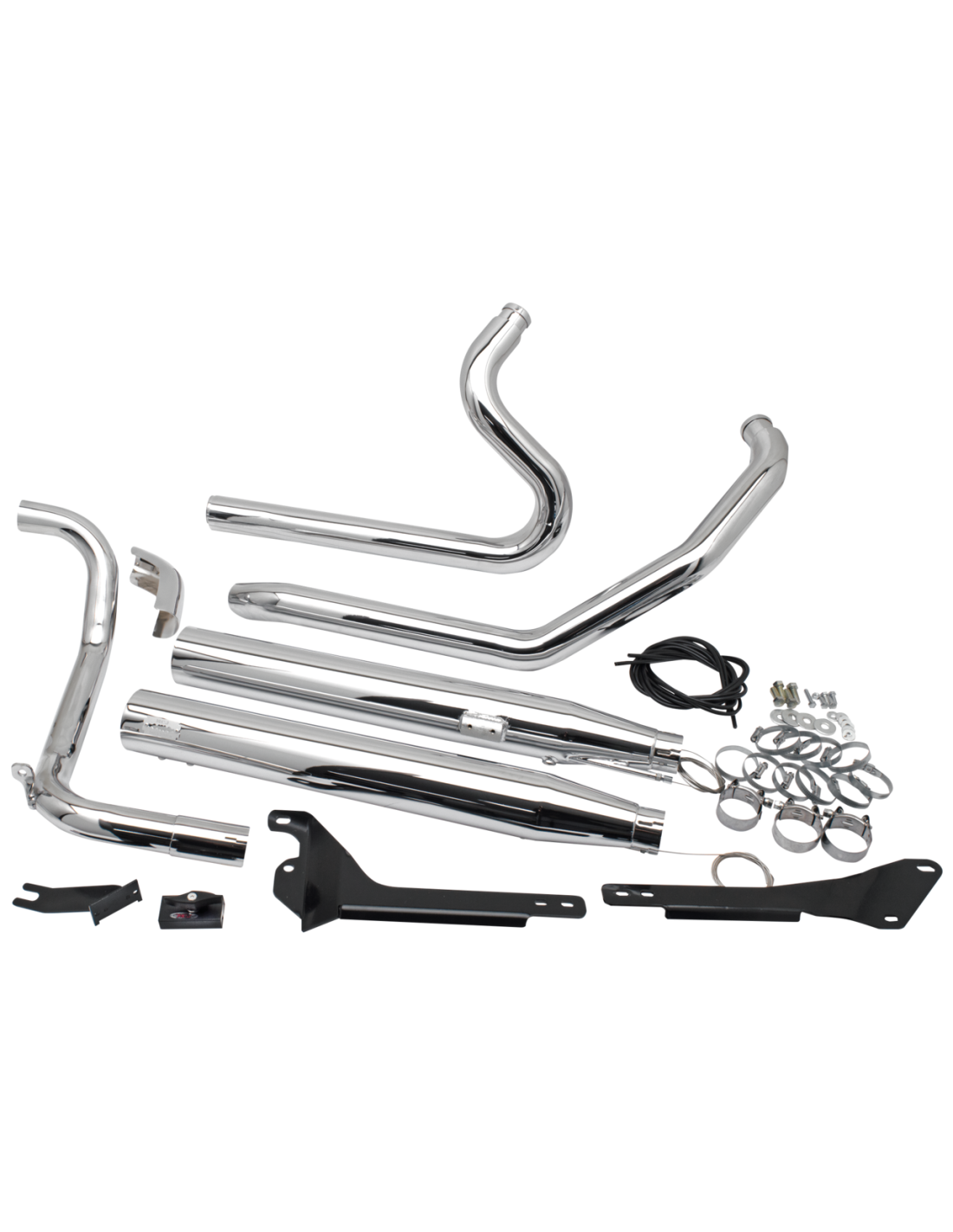 Complete 2-into-2 exhaust system with E-approved mufflers that feature adjustable exhaust valves that allow you to tune the sound of your bike the way you like it, but still get back to what is legal. The front pipe exits to the right and the rear pipe is a cross-over to the left. These exhaust systems come complete with a manual operated adjusting lever that can be placed on either the handlebar or below the tank. Electric operated adjusting motors with a key fob style remote control are available as an option. Muffler end caps must be ordered separately.