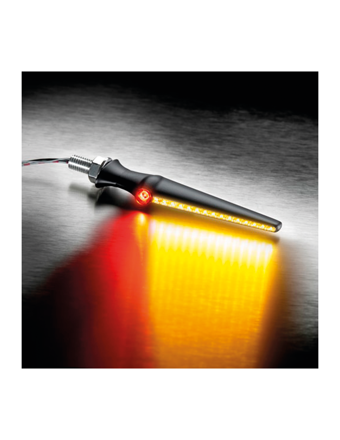 The Kellermann Jetstream is probably the most spectacular motorcycle indicator build to date. The shape is extremely aerodynamic. No other motorcycle indicator with sequential lighting and E-approval gets even close, the brightness of the Kellermann Jetstream is unmatched. The Jetstream measures 14mm high, 26mm deep, 98mm long and has M8x20 mounting stud. Turn signal and turn signal with running light are EU-approved for use on the front and rear, the combined tail/turn/brake light is EU-approved for rear use. Lights are sold each.