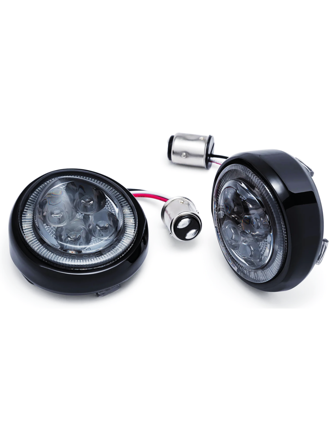The Fang turn signal light inserts fit straight into OEM bullet style turn signals and are a great way to add modern styling and class to your bike while also increasing visibility. Ciro has engineered the lenses to amplify light output for maximum brightness. A Load Equalizer is required for 2002-2013 Sportster, 2000-2010 Softail, 2009-2011 Dyna and 2010-2013 Touring. All lights are sold in sets of 2 for left and right and are DOT approved.