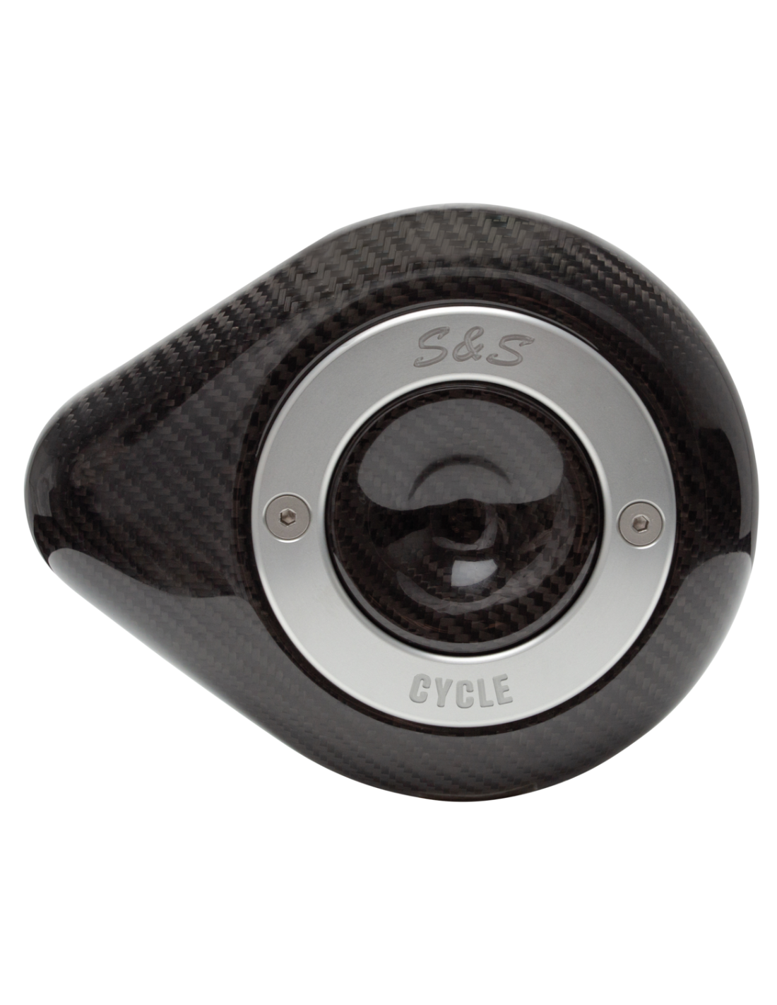 A modern interpretation of the classic S&S Teardrop air cleaner. The vacuum formed carbon fiber air cleaner kits give your bike a sporty high-end look. Cover features a clear coating and billet ring with S&S logo. Backing plate and filter element come from the proven S&S Stealth air cleaner kits. The carbon fiber cover is also available separately for bikes with an existing S&S Stealth air cleaner installed.