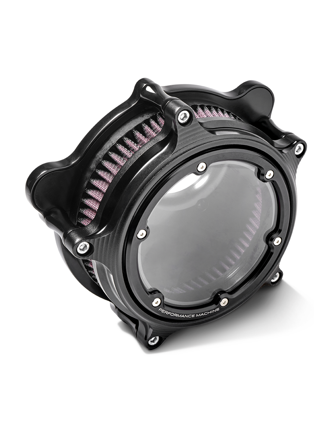 Performance Machine's Vision Air Cleaner features a billet aluminum bezel to attach the polycarbonate window for structural integrity and to provide even distribution of the clamping force to provide window cracking. The thick the UV and abrasion resistant window will maintain clarity for years. Air cleaner features a K&N Filter that allows high volume airflow resulting in increased horsepower.