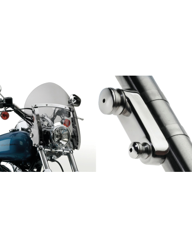 Fits 41mm front forks on 1980-1985 FXWG Wide Glide, 1983 FXDG Disc Glide, 1993-2005 FXDWG Dyna Wide Glide, 1984-2012 FXST Softail Standard, 1999-2009 FXSTB Night Train, 1987-2010 FXSTC Heritage Classic, 2000-2007 FXSTD Deuce, Complete tinted Switchblade Shorty windscreen with Quick-Release mounting bracket kit, 11.5 (29.2cm) high and 18.5 (47cm) wide